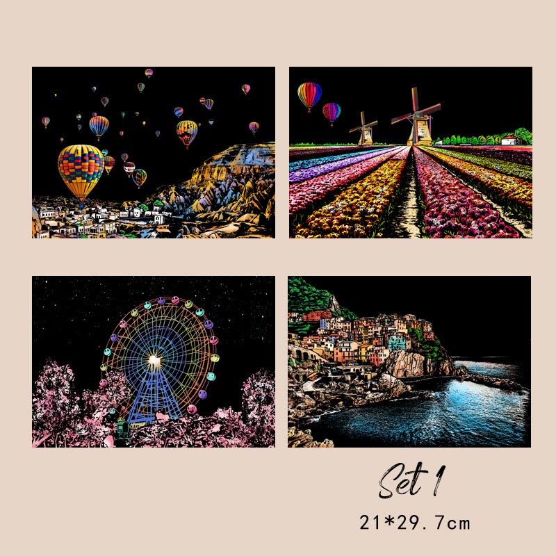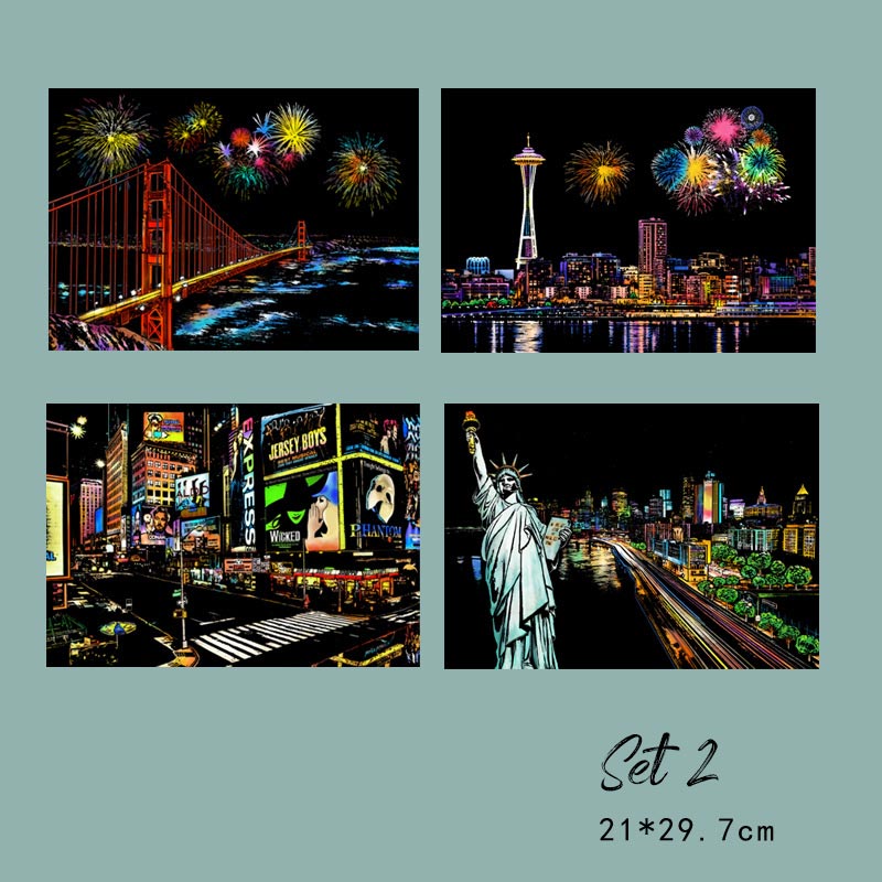 Креативно DIY изкуство: Този комплект включва четири изящно проектирани сцени, които предлагат приятно и лесно творческо пътешествие. Изстържете черното покритие, за да разкриете ярки градски пейзажи и да освободите вътрешния си артистичен талант.