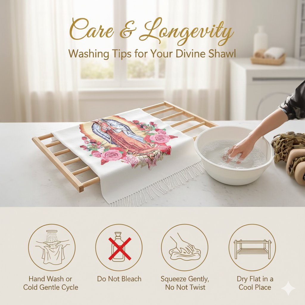 Всеки шал е украсен с изящно изображение на Дева Мария, символизиращо мир, надежда и божествена закрила. Повече от моден аксесоар, той служи като ежедневно напомняне през този свещен сезон да поддържаме вярата си и да ценим благодарността.