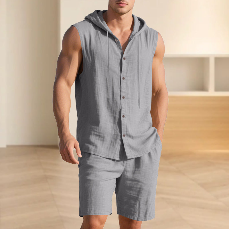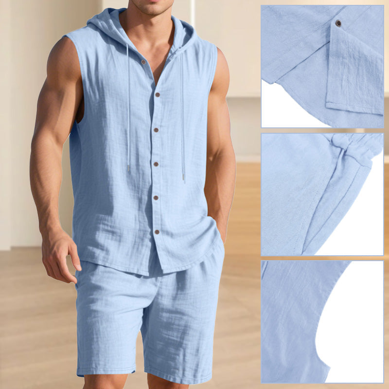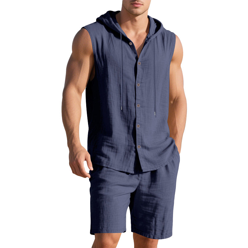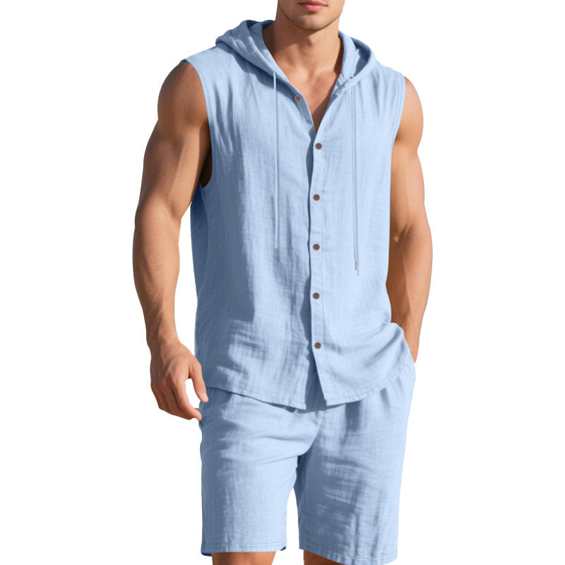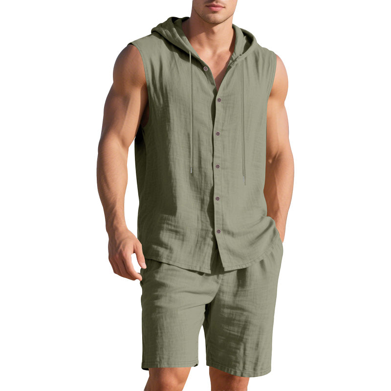 Пакетът включва: 1* мъжки комплект от ленена жилетка с качулка и къси панталони