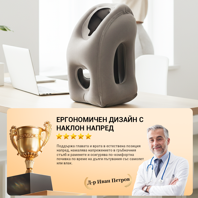 ЕРГОНОМИЧЕН ДИЗАЙН, ОБЪРНАТ НАПРЕД - Поддържа главата и врата в естествено положение, обърнато напред, намалявайки напрежението върху гръбначния стълб и раменете, позволявайки по-комфортна почивка по време на дълги пътувания със самолет или влак.