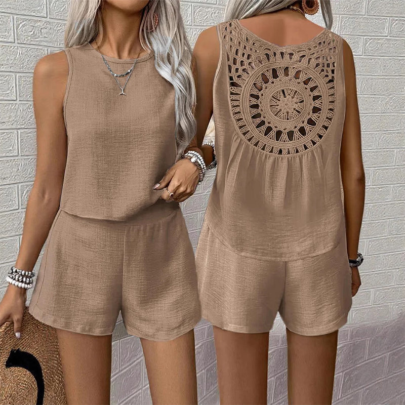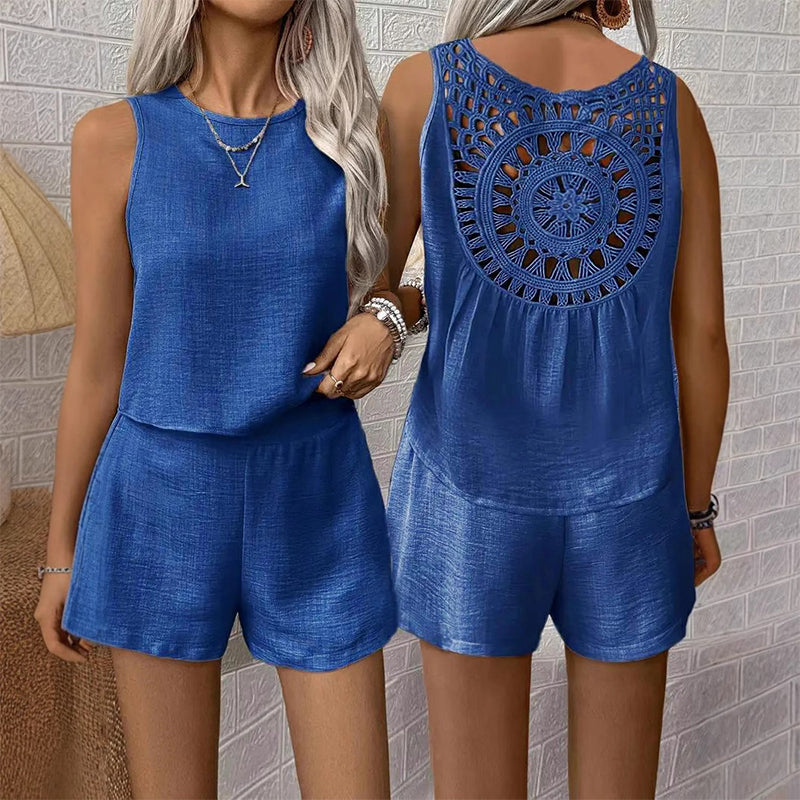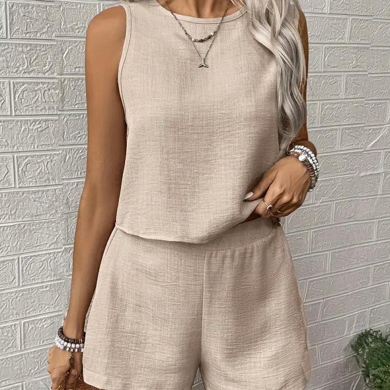 Универсален комплект от две части - Този комплект се състои от горнище без ръкави и чифт подходящи къси панталони, които могат лесно да се координират. Носете ги заедно, за да създадете елегантен комплект, или ги носете поотделно за разнообразни варианти на облекло. Свободната кройка осигурява удобство за всички типове тела.